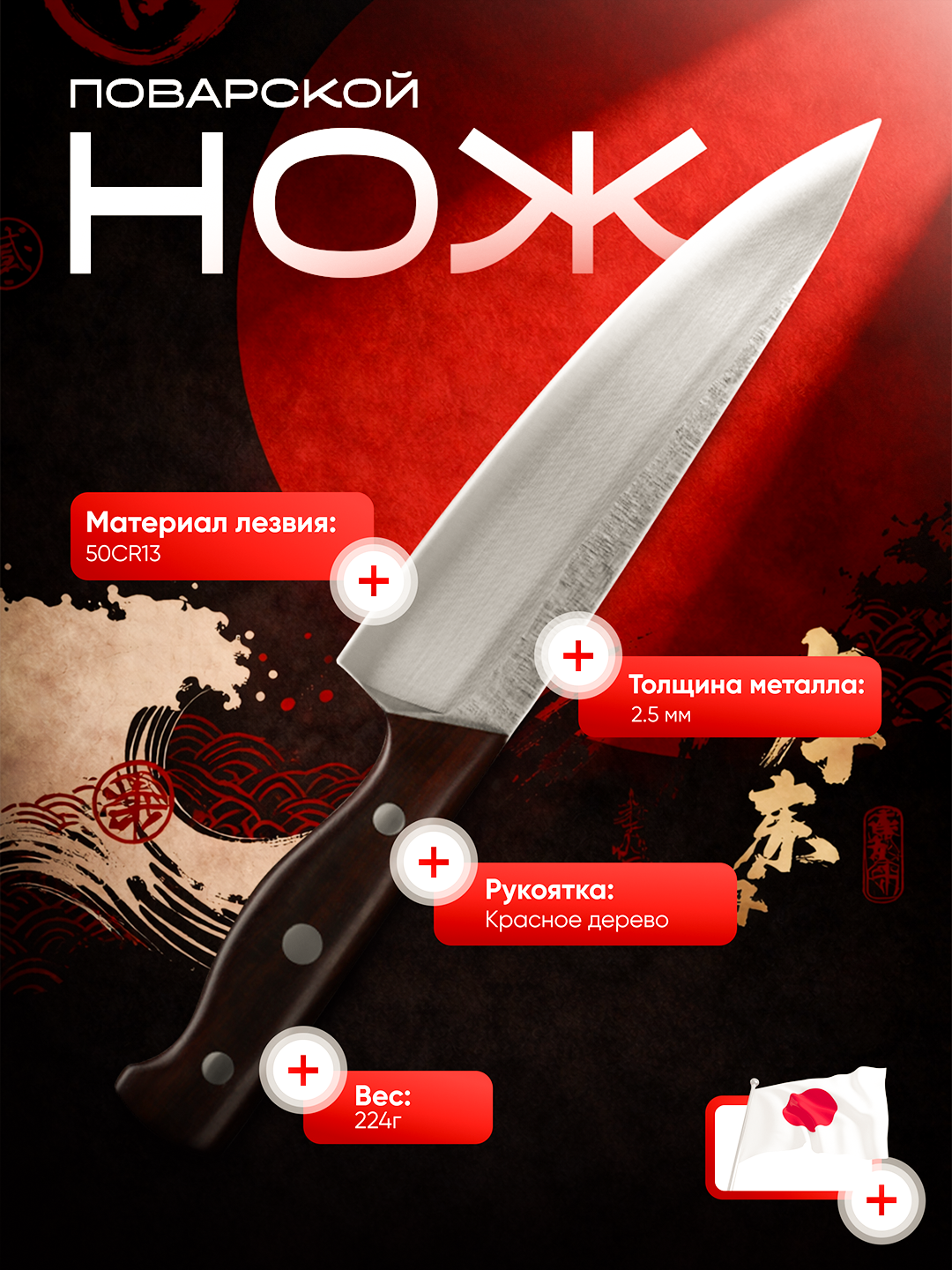 Поварской нож Шеф, лезвие 19.5 см, сталь 50Cr13, рукоять из красного дерева